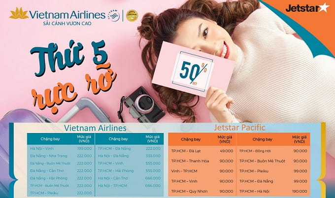 Theo đó, khuyến mãi “Thứ 5 rực rỡ” đến từ thương hiệu kép Vietnam Airlines - Jetstar Pacific đã quay trở lại vào tuần này với loạt vé máy bay giá cực rẻ được áp dụng mở bán cho nhiều hành trình nội địa hấp dẫn.