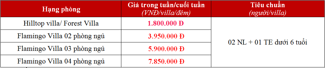 Trẻ em dưới 02 tuổi(Được miễn phí thêm; không quá 01 TE / 01 phòng ngủ - Trường hợp phát sinh thêm tính bằng giá trường hợp Trẻ em 02 – dưới 06 tuổi) |